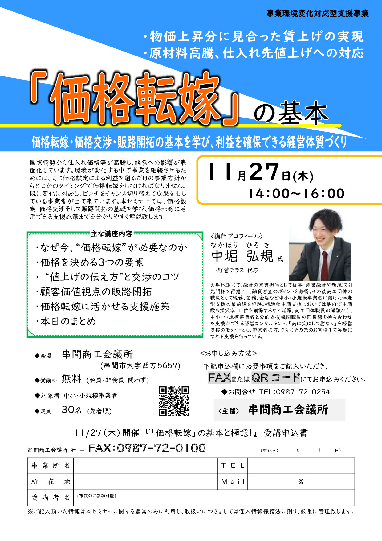本セミナーでは、価格設定や価格交渉の基本を分かりやすく学ぶとともに、取引先との関係を保ちながら価格転嫁を進めるポイントを具体例を交えて紹介します。さらに、価格転嫁を後押しするための国や自治体の支援制度についても解説します。今後の経営改善や利益確保に向けて、一歩を踏み出すための内容です。ぜひ、ご参加ください。